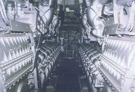 The four diesel engines are MTU 20V 1163 20V TB73 L units, rated 6,500kW each, and the two gas turbines are LM 2500 systems, rated at 22,000kW each.