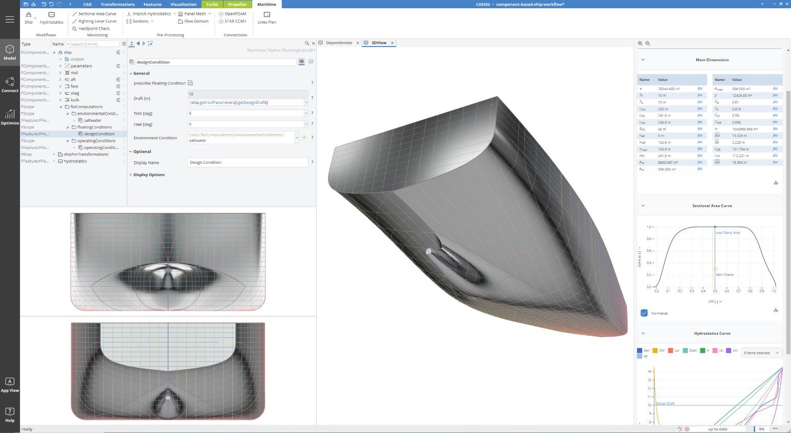 With its flagship software platform, CAESES, FRIENDSHIP SYSTEMS creates a single cohesive workflow and automated design process that uses parametric modelling, optimisation strategies, and computational fluid dynamics (CFD). Ship designers can use this to explore a wide range of hull variants and make informed, data-driven decisions during the design process.