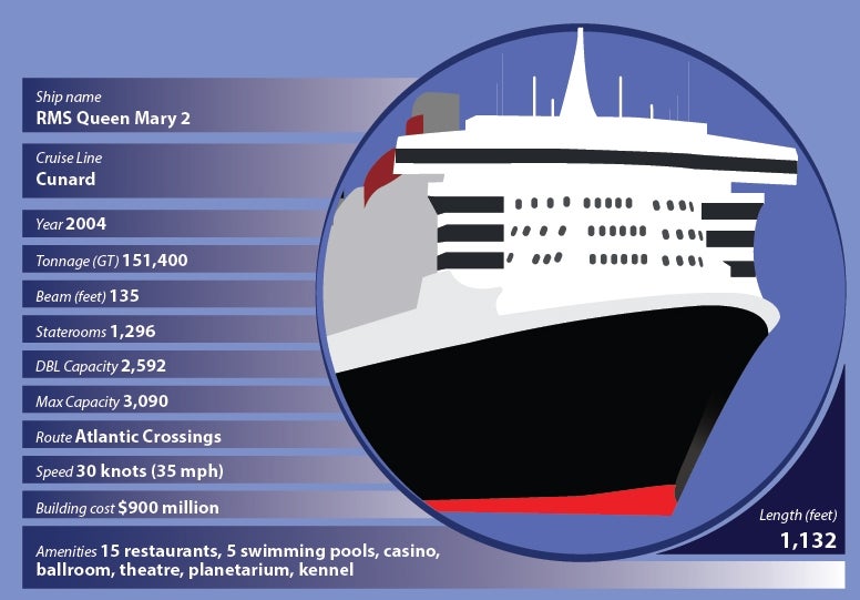 Queen Mary 2 (or QM 2), built at a cost of $900m, is the largest ocean liner ever built since the Queen Elizabeth 2 in 1969. The QM 2 entered into service in January 2004 as a flagship of Cunard Line and currently sails on transatlantic voyages between Southampton and New York.