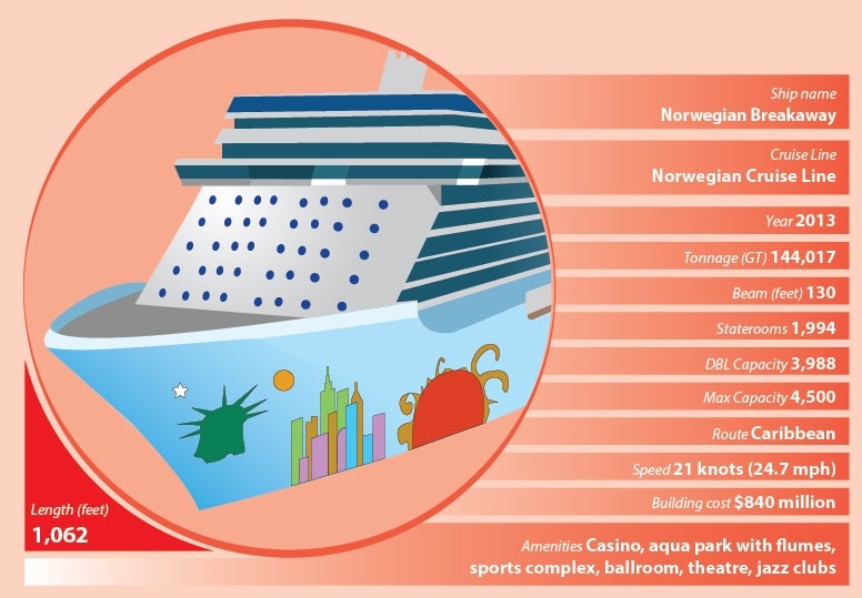 Norwegian Breakaway is the first of two Project Breakaway cruise ships built for Norwegian Cruise Line (NCL). The ship was introduced into service in April 2013 and currently sails to Bermuda, Southern Caribbean and the Bahamas, as well as Florida. It is the biggest cruise ship ever homeported in New York.