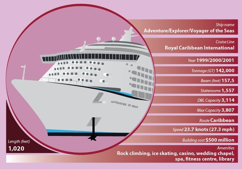 Each ship has a length of 1,020ft and beam of 157.5ft. The gross tonnage of Adventure of the Seas is 142,000t, while that of the other two ships is 138,000t. All the three ships cruise at a speed of 22kt.