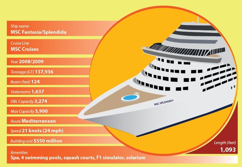 MSC Fantasia and MSC Splendida are two Italian style Fantasia class cruise ships owned and operated by MSC Cruises, a division of the Switzerland-based Mediterranean Shipping Company. MSC Fantasia entered service in December 2008. Its sister ship MSC Splendida sailed for maiden voyage in the Mediterranean in March 2009. Both ships were built by STX Europe at its St Nazaire shipyard in France.